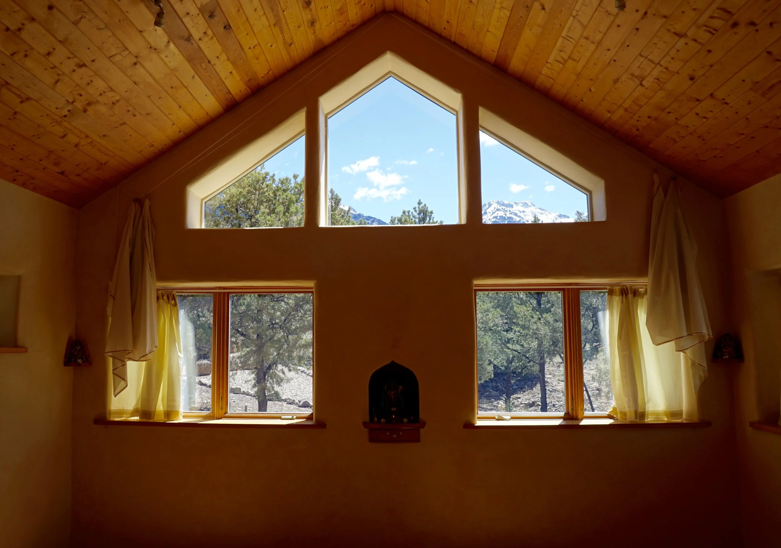 Unplugged from the electrical grid, Shakti Sharanam’s straw-bale structures are sustainably powered and heated by solar energy. The natural building materials provide a pure environment, exceptionally conducive to study and practice. Shakti Sharanam has been a long-time feature of the Crestone Energy Fair home tour, as well as part of the Camino de Crestone pilgrimage tour.